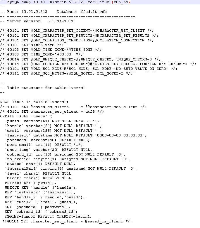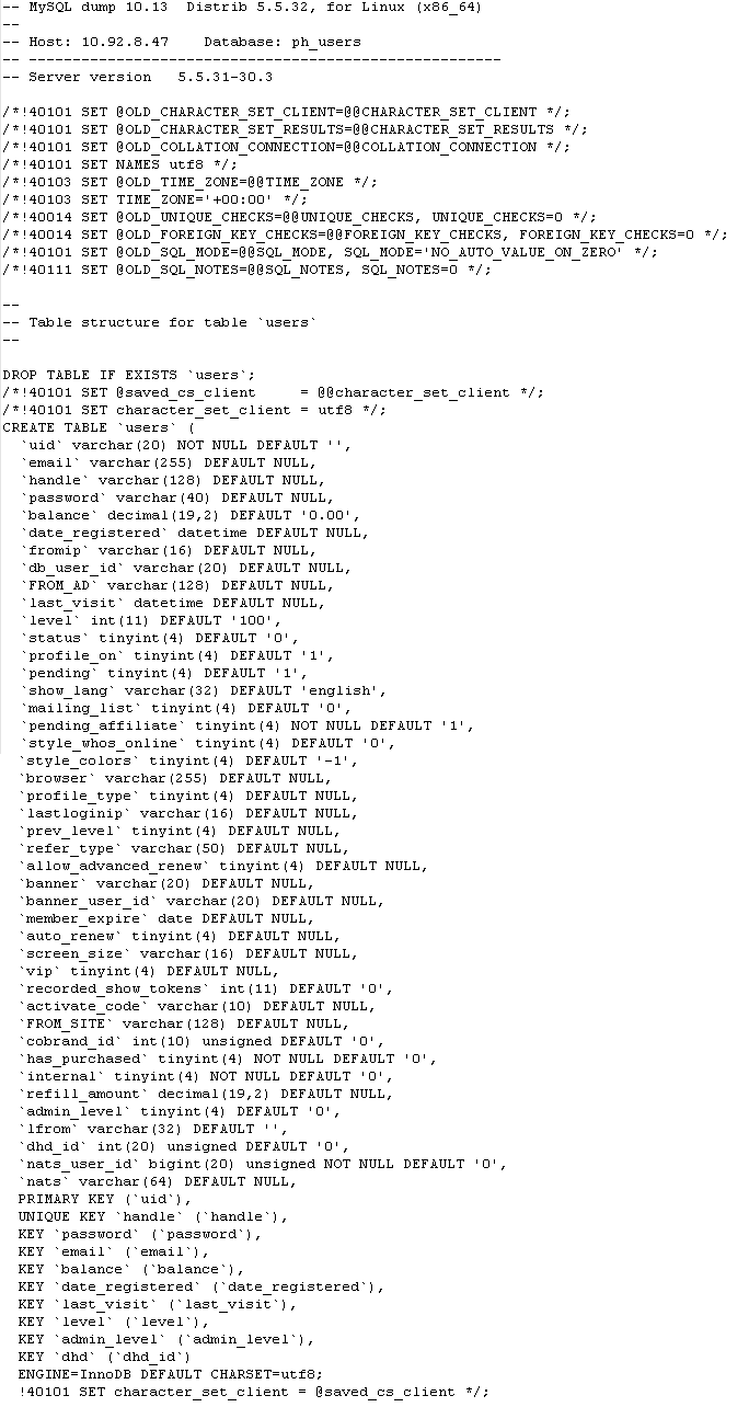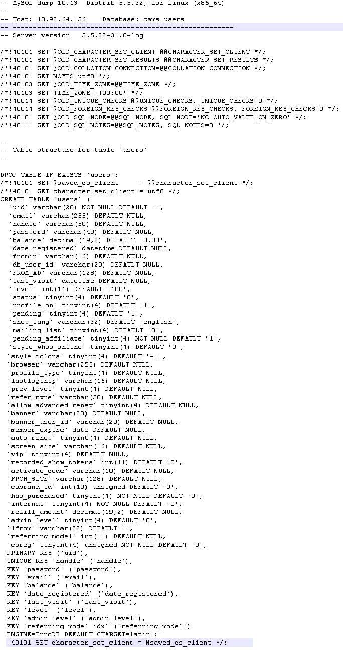 Provided below are the table schemas for (in order), AdultFriendFinder.com, Cams.com, Penthouse.com. These are mostly of interest to IT professionals.